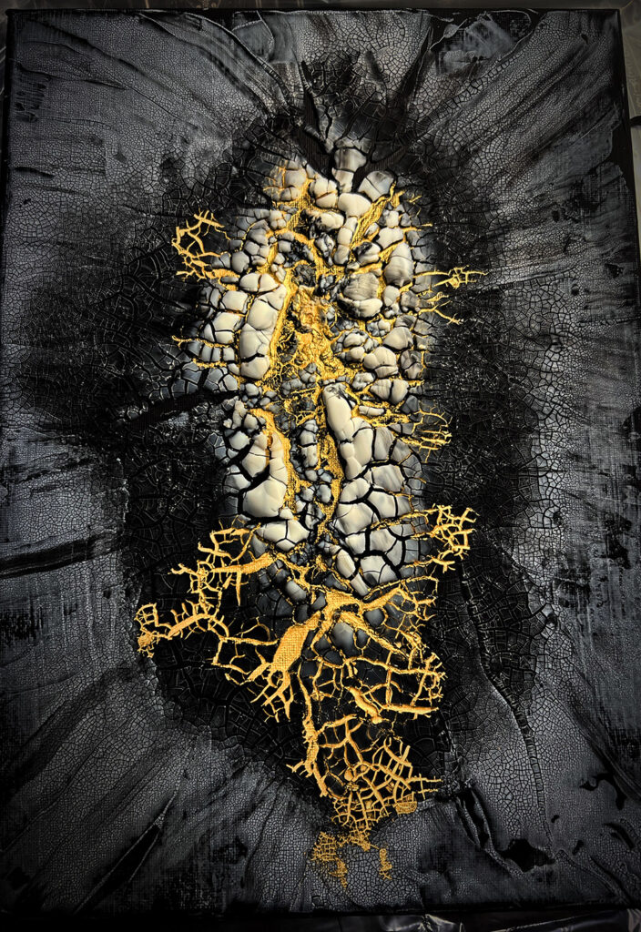 抽象画やガラス彫刻、黒紙に金で描いた図像など、ひび割れた黒の地層や光を透かす紋様を通して、