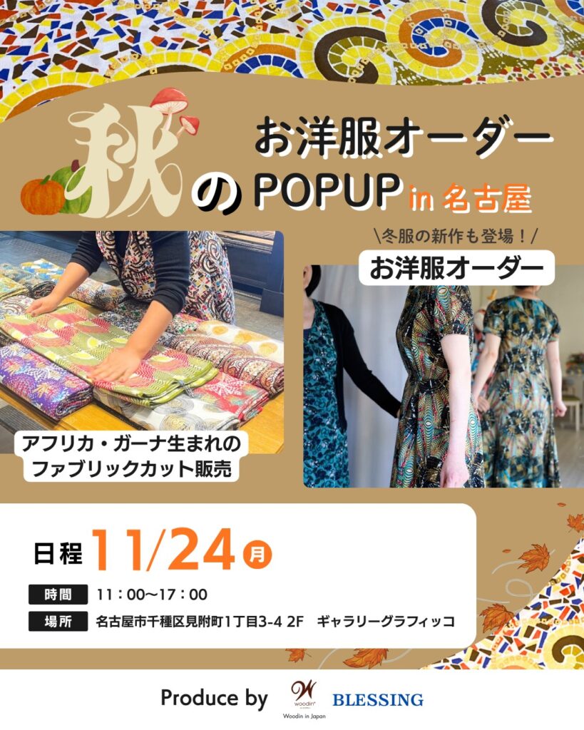 *開催日時*11月24日(月・祝)11:00~17:00 名古屋で秋のPOPUPやります🍁 アフリカ・ガーナの布 “Woodin” でつくるお洋服オーダー会👗✨冬の新作も登場します! アフリカ・ガーナで作られるアフリカ布「Woodin」生地の販売もあります...